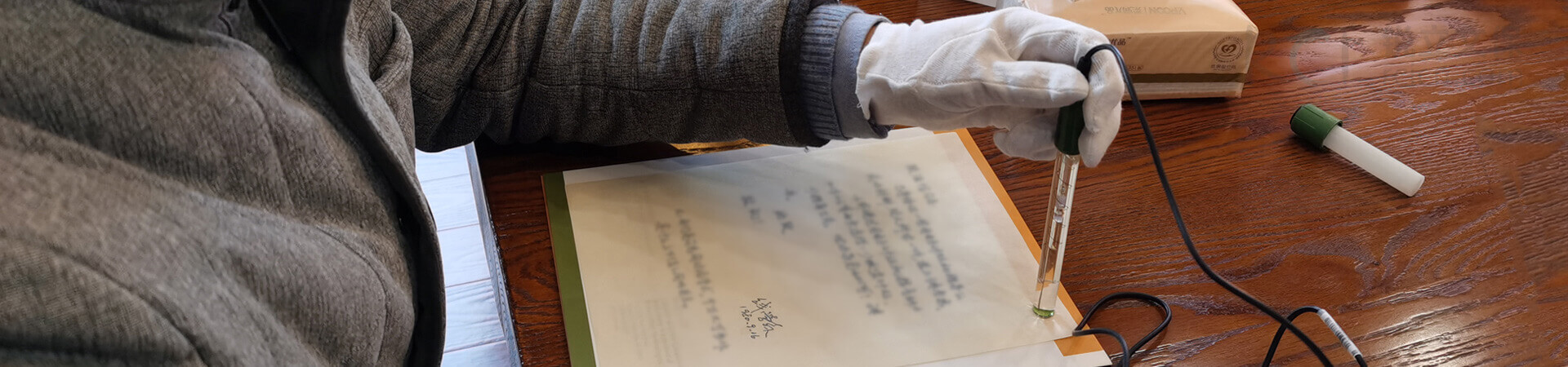 在對檔案進(jìn)行酸化調(diào)研的同時(shí),北京市檔案館亦在摸索適合館藏檔案脫酸保護(hù)的技術(shù)方法。通過使用國內(nèi)外不同品牌脫酸液的反復(fù)試驗(yàn),并對脫酸效果進(jìn)行反復(fù)對比、論證,使用Bookkeeper脫酸技術(shù)對紙質(zhì)檔案的去酸能達(dá)到最佳保護(hù)效果。